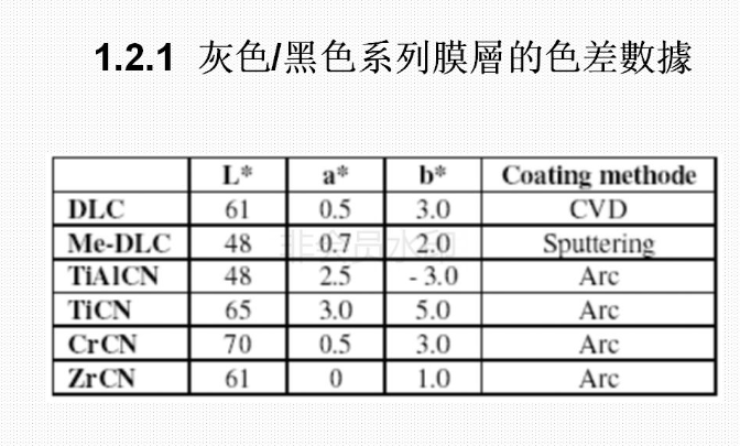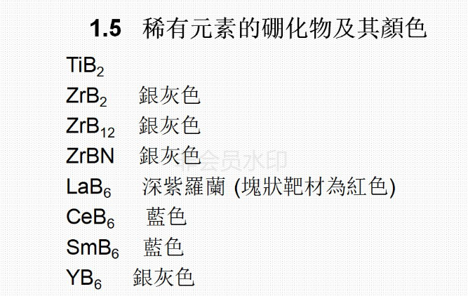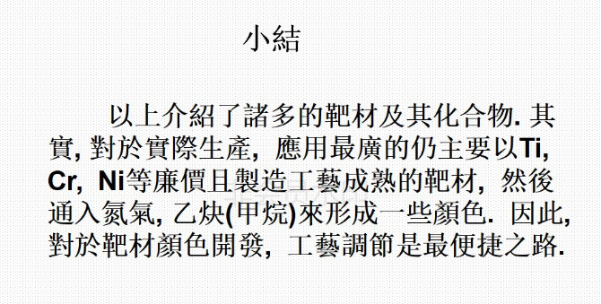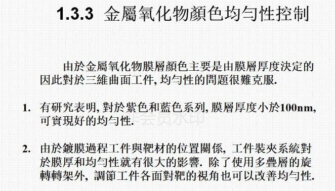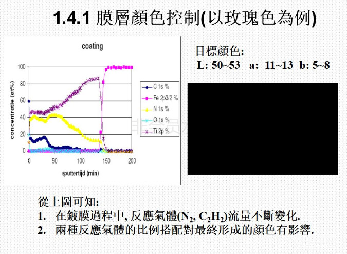 6)、目前能夠做出的膜層的顏色有深金黃色,淺金黃色,咖啡色、古銅色、灰色、黑色、灰黑色,七彩色等。通過(guò)控制鍍膜過(guò)程中的相關(guān)參數(shù),可以控制鍍出的顏色;鍍膜結(jié)束后可以用相關(guān)的儀器對(duì)顏色值進(jìn)行測(cè)量,使顏色得以量化,以確定所鍍出的顏色是否滿足要求。