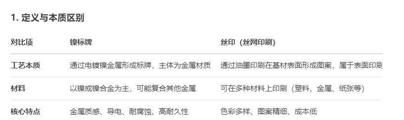 鎳標牌和絲?。ńz網印刷)是兩種完全不同的工藝,用途、制作方式和最終效果都有顯著區別。以下是它們的核心差異對比: